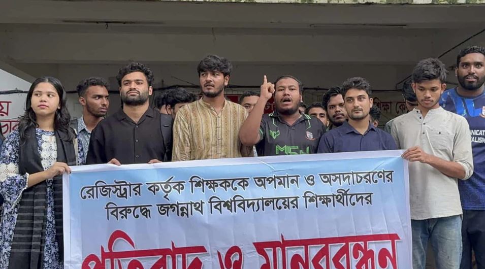 জগন্নাথ বিশ্ববিদ্যালয়ের (জবি) ভারপ্রাপ্ত রেজিস্ট্রার অধ্যাপক শেখ মো গিয়াসউদ্দিন দ্বারা এক শিক্ষককে অপমান এবং অসদাচরণের বিরুদ্ধে প্রতিবাদ ও মানববন্ধন করেছেন বিশ্ববিদ্যালয়ের শিক্ষার্থীরা। একইসঙ্গে মানববন্ধনে রেজিস্ট্রারের পদত্যাগের দাবি জানান তারা।