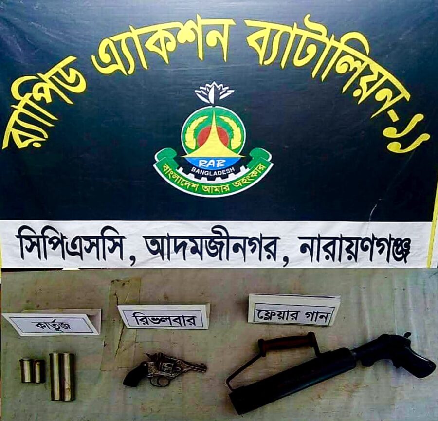 অভিযান পরিচালনাকালে ০১ টি বিদেশী রিভলভার যার বডিতে Made in England লেখা রয়েছে, ০১ টি বিদেশী Flare Gun, ০২ রাউন্ড তাজা গুলি ও ০২ রাউন্ড কার্তুজ সহ ০৩ জন অস্ত্রধারী সন্ত্রাসীদের গ্রেফতার করে। গ্রেফতারকৃত আসামিরা হলো ১। খোরশেদ (৪৬), পিতা-মুসলিম, মাতা-সাফিয়া খাতুন, ২। রিপন (৩০), পিতা-লালমোহন লাল, মাতা-বিপিয়া রাণী, ৩। জয় (২৬), পিতা-মোঃ শহীদ, মাতা-জীবনী বেগম, সর্ব সাং-গোদনাইল, থানা- সিদ্ধিরগঞ্জ, জেলা-নারায়ণগঞ্জ। আটককৃত আসামিদের প্রাথমিক জিজ্ঞাসাবাদে জানা যায় যে, তারা অবৈধ ভাবে বিদেশী আগ্নেয়াস্ত্র দ্বারা সিদ্ধিরগঞ্জ সহ নারায়ণগঞ্জের বিভিন্ন এলাকায় সাধারণ মানুষকে ভয়-ভীতি ও সন্ত্রাসী কার্যক্রম করে আসছিল। জিজ্ঞাসাবাদে আরো জানা যায় যে, তাদের কাছে থাকা অস্ত্রগুলো কোন বৈধ কোন কাগজপত্র নাই।
