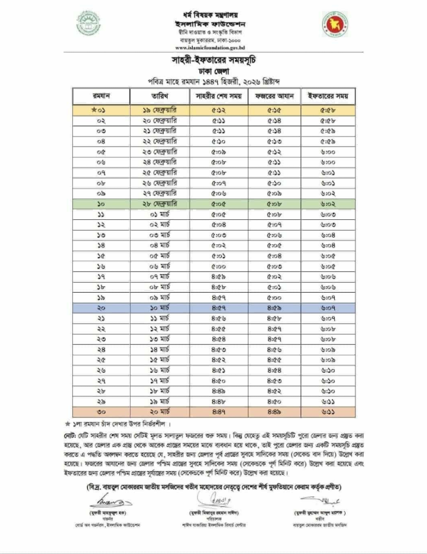 সময়সূচি অনুযায়ী, ১৯ ফেব্রুয়ারি প্রথম রমজানে ঢাকায় সেহরির শেষ সময় ভোররাত ৫টা ১২ মিনিট ও ইফতারির সময় ৫ টা ৫৮ মিনিট।