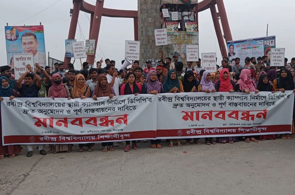 রবীন্দ্র বিশ্ববিদ্যালয়ের স্থায়ী ক্যাম্পাস নির্মাণে ডিপিপি (উন্নয়ন প্রকল্প প্রস্তাব) দ্রুত অনুমোদনের দাবিতে মানববন্ধন কর্মসূচি পালন করেছেন বিশ্ববিদ্যালয়ের শিক্ষার্থীরা। বৃহস্পতিবার দুপুরে সিরাজগঞ্জের হাটিকুমরুল গোলচত্বর এলাকায় আয়োজিত এই মানববন্ধনে শিক্ষার্থীরা অংশ নেন।