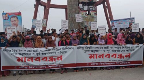 স্থায়ী ক্যাম্পাস নির্মাণের দাবিতে রবীন্দ্র বিশ্ববিদ্যালয় শিক্ষার্থীদের মানববন্ধন